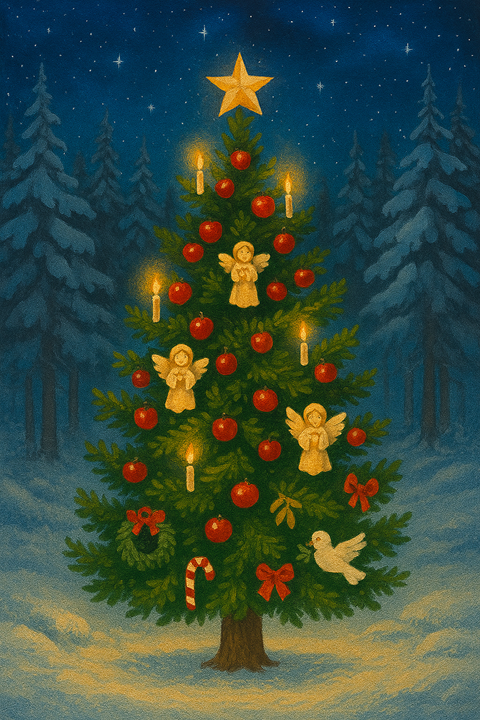 Al mattino, il cielo si illuminò di una luce dorata. Gli angeli, commossi dal gesto dell’abete, lo adornarono con stelle, luci e frutti d’oro. Da quel giorno, ogni Natale, gli uomini decorano l’albero per ricordare che anche il più umile tra noi può diventare luce per gli altri.