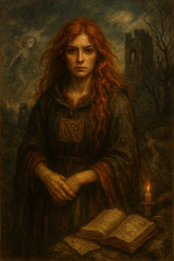 Ecco un’immagine ispirata a Isobel Gowdie, la leggendaria strega scozzese del XVII secolo, famosa per le sue confessioni dettagliate e poetiche sulla stregoneria, i rituali e gli incontri con il mondo delle fate.